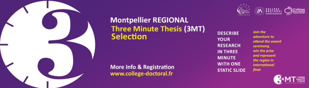 Doctoral students, whether attached to the Doctoral College of the University of Montpellier or the Languedoc-Roussillon Doctoral College, wishing to participate in 3 Minutes Thesis must: